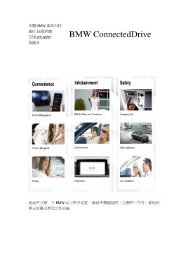 主題:BMW 產品科技 單位:技術訓練 BMW ConnectedDrive日期:2013/2/20 頁數:3 這是在介紹一台 BMW 車子的多功能,像是手機遙控阿、上網阿…等等,都依照 車主的需求所設計的功能
