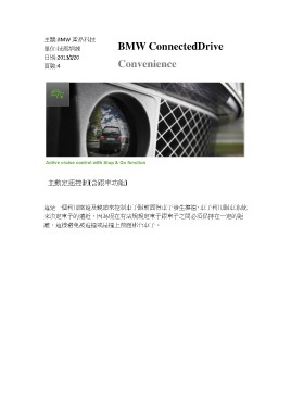 主題:BMW 產品科技 BMW ConnectedDrive 單位:技術訓練 Convenience 日期:2013/2/20 頁數:4 主動定速控制(含跟車功能) 這是一個利用雷達及鏡頭來控制車子跟前面得車子發生擦撞,車子利用跟車系統 來決定車子的遠近,因為現在有法規規定車子跟車子之間必須保持在一定的距 離,這樣避免被追撞或是撞上前面那台車子。