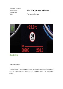 主題:BMW 產品科技 BMW ConnectedDrive 單位:技術訓練 Convenience 日期:2013/2/20 頁數:9 速限警告標示 因為現在的道路上有許多限速警告的牌子,有些車主因為要愾牌子上的限速而分 心,往往車禍都是因為沒注意而發生的,所以 BMW 在儀表板上做一個限速警告 的系統。