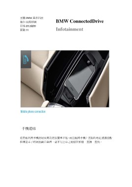 主題:BMW 產品科技 BMW ConnectedDrive 單位:技術訓練 Infotainment 日期:2013/2/20 頁數:11 手機連結 這是能利用手機連結來將設定放置車子裡,而且能將手機上查詢的地址透過這動 作傳至車子的液晶顯示器裡,就不用上車之後還在那邊一直調一直找。