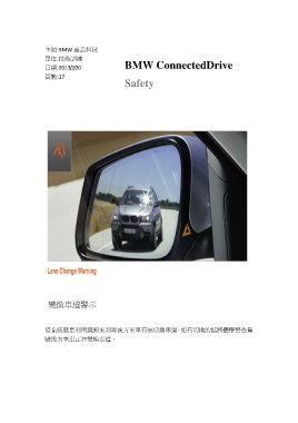 BMW ConnectedDrive 主題:BMW 產品科技 Safety 單位:技術訓練 日期:2013/2/20 頁數:17 變換車道警示 這系統就是利用鏡頭來判辨後方來車有無切換車道,如有切換的話將體醒警告駕 駛後方來車正在變換車道。