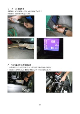 七、HC,CO 濃度異常 步驟:接到廢氣分析儀,然後查看數據看是否正常 故障情形: 對照標準值是否正常 八、冷卻液量異常/水管/接頭故障 1 步驟:檢查(水位是否到達上限) 水管(是否有龜裂) (破損漏水) 2 故障情形:水管及接頭 (龜裂)(破損)(漏水) 水位(過多或過少) 10