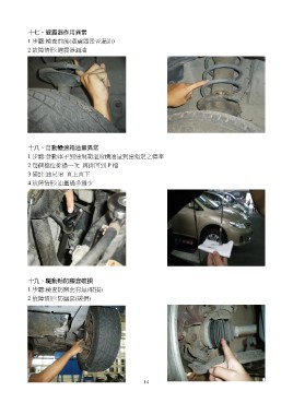 十七、避震器作用異常 1 步驟:檢查前後(避震器是否漏油) 2 故障情形:避震器漏油 十八、自動變速箱油量異常 1 步驟:發動車子到達規範溫度機油量到達指定之標準 2 每個檔位排過一次 再排回到 P 檔 3 備註:油尺須 直上直下 4 故障情形:油量過多過少 十九、驅動軸防塵套破損 1 步驟:檢查防塵套有無(破損) 2 故障情形:防塵套(破損) 14