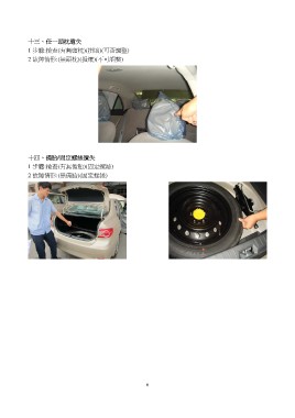 十三、任一頭枕遺失 1 步驟:檢查(有無頭枕)(損壞)(可否調整) 2 故障情形:(無頭枕)(損壞)(不可調整) 十四、備胎/固定螺絲遺失 1 步驟:檢查(有無備胎)(固定螺絲) 2 故障情形:(無備胎)(固定螺絲) 6