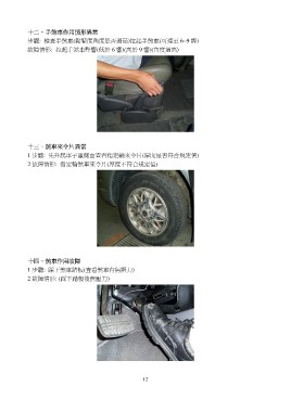 十二、手煞車作用情形異常 步驟: 檢查手煞車(鬆緊度角度是否過高)拉起手煞車(可達至 6~9 響) 故障情形: 拉起手煞車聲響(低於 6 響)(高於 9 響)(角度過高) 十三、煞車來令片異常 1 步驟: 先升起車子重側面查看指定輪來令片(厚度是否符合規定值) 2 故障情形: 指定輪煞車來令片(厚度不符合規定值) 十四、煞車作用故障 1 步驟: 踩下煞車踏板(查看煞車有無壓力) 2 故障情形: (踩下踏板後無壓力) 12