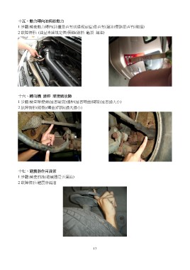 十五、動力轉向油與始動力 1 步驟:檢查動力轉向(油量是否有到達規定值)是否有(漏油)管路是否有(破損) 2 故障情形: (油量未達規定值)管路(破損 龜裂 漏油) 十六、轉向機 連桿 球接頭故障 1 步驟:檢查球接頭(是否破裂)連桿(是否彎曲)間隙(是否過大小) 2 故障情形(破裂)(彎曲)間隙(過大過小) 十七、避震器作用異常 1 步驟:檢查前後(避震器是否漏油) 2 故障情形:避震器漏油 13