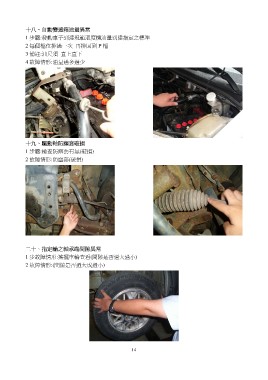 十八、自動變速箱油量異常 1 步驟:發動車子到達規範溫度機油量到達指定之標準 2 每個檔位排過一次 再排回到 P 檔 3 備註:油尺須 直上直下 4 故障情形:油量過多過少 十九、驅動軸防塵套破損 1 步驟:檢查防塵套有無(破損) 2 故障情形:防塵套(破損) 二十、指定輪之軸承端間隙異常 1 步故障情形:搖擺車輪查看(間隙是否過大過小) 2 故障情形:(間隙是否過大或過小) 14