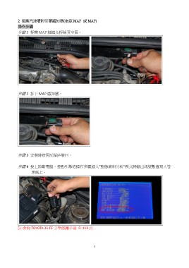 2 更換汽油噴射引擎感知器(指定 MAF 或 MAP) 操作步驟 步驟 1 拆開 MAP 插頭及拆除真空管。 步驟 2 拆下 MAP 感知器。 步驟 3 安裝時按照反順序裝回。 步驟 4 接上診斷電腦,發動引擎依操作步驟進入”動態資料分析”模式將輸出訊號數值寫入答 案紙上。 註:參閱 TOYOTA 3S-FE 引擎修護手冊 FI-113 頁 3