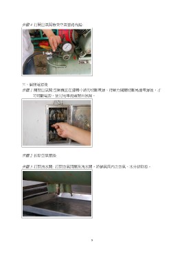 步驟 4 打開出氣閥檢查空氣管路洩漏: 三、關閉電源後 步驟 1 關閉出氣閥:空壓機正在運轉中請勿切斷電源,待壓力開關切斷馬達電源後,才 可切斷電源。使用完畢後關閉出氣閥。 步驟 2 拆除空氣管路: 步驟 3 打開洩水閥: 打開空氣開關及洩水閥,將儲氣筒內之空氣、水分排除掉。 9