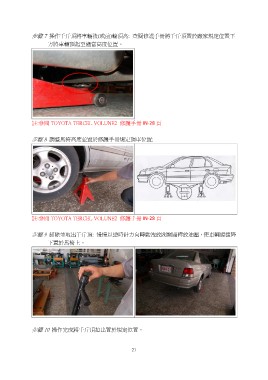步驟 7 操作千斤頂將車輛後(或前)輪頂高: 查閱修護手冊將千斤頂置於廠家規定位置下 方將車輛頂起至適當高度位置。 註:參閱 TOYOTA TERCEL VOLUNE2 修護手冊 IN-28 頁 步驟 8 調整馬椅高度並置於修護手冊規定頂車位置: 註:參閱 TOYOTA TERCEL VOLUNE2 修護手冊 IN-28 頁 步驟 9 卸除並取出千斤頂: 慢慢以逆時針方向轉動洩放閥開關釋放油壓,使車輛緩緩降 下置於馬椅上。 步驟 10 操作完成將千斤頂拉出置於規定位置。 21