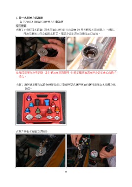 9. 使用水箱壓力試驗器 以 TOYOTA PREMIO2.0 架上引擎為例 操作步驟 步驟 1 正確打開水箱蓋: 將水箱蓋以逆時針方向旋轉 1/4 圈先釋放水箱內壓力,待壓力 釋放完畢後再完全旋開水箱蓋。確認冷卻水液面到達添加口高度。 註:確認引擎為冷車狀態,當引擎為高溫裝態時,拆卸水箱蓋高溫高壓冷卻水會造成嚴重 燙傷。 步驟 2 選擇適當壓力試驗器轉接頭:依引擎廠牌型式選擇適宜的轉接頭接上水箱壓力試 驗器。 步驟3 安裝水箱壓力試驗器: 22