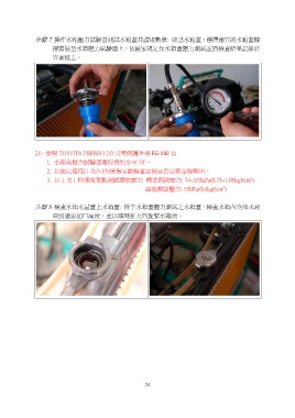 步驟 8 檢查水箱水量蓋上水箱蓋: 拆下水箱蓋壓力測試之水箱蓋,檢查水箱內冷卻水液