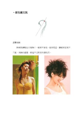 ‧個性龐克風 溫馨提醒 將兩側頭髮往中間集中,髮梢不要收,最好偏直,讓髮梢呈現不 工整、飛揚的感覺,創造不受拘束的個性美。