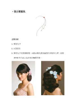 ‧復古懷舊風 溫馨提醒 1. 髮髻往下 2. S 型波浪 3. 髮髻往下近頸部梳理,或將長髮的波浪處理得浮貼有光澤,就像 30~60 年代夜上海女性的嫵媚形象。