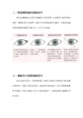 二、眼型與眼線的修飾技巧 新秘在幫新娘化妝時常會碰到不同的眼型,在面對不同眼型的新 娘時,需要針對不同眼型,搭配不同的眼線來進行處理,不能將每個 新娘的眼線都畫得又粗又長,以免弄巧成拙。 三、鼻影的介紹與修飾技巧 就化妝技巧而言,若新娘的鼻子長度及寬度各占臉部的 1/3 是屬 於標準型,當鼻子過短或過長,寬度過窄或過寬時,則必須要透過鼻 影的修飾,使其在視覺上的大小與長短適中,方能達到美化整體妝容 的功效。