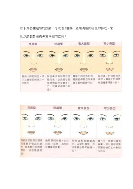 以下為各種避型的修飾,可依個人需要,運用明色與暗色的粉底,來 加以調整鼻梁與鼻翼兩側的位置: