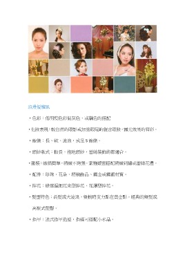 浪漫優雅風 ‧色彩:低明度色彩偏灰色、或藕色的搭配 ‧化妝表現:較自然的眼影或加強眼尾的復古眼妝,霧光效果的唇彩。 ‧線條:長、軟、波浪,或呈 S 線條。 ‧頭紗款式:較長、拖地頭紗,蕾絲裝飾的都適合。 ‧服裝:線條簡單,精緻不誇張。素雅緞面搭配精緻刺繡或蕾絲花邊。 ‧配件:珍珠、花朵、精緻飾品、霧金或霧銀材質。 ‧捧花:綠莖握把花束型捧花、花瀑型捧花。 ‧髮型特色:長髮或大波浪,盤梳時支力點在黃金點。經典的盤髮或 高梳式髮髻。 ‧指甲:法式指甲造型,指緣可搭配小水晶。