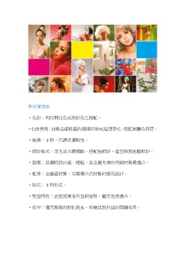 叛逆個性風 ‧色彩:利用對比色或亮彩色之搭配。 ‧化妝表現:前衛具個性感的煙燻彩妝或造型睫毛,搭配裸膚色唇膏。 ‧線條:不拘,但講求獨特性。 ‧頭紗款式:羽毛或水鑽帽飾,搭配短頭紗、造型誇張地棚頭紗。 ‧服裝:具獨特設計感。硬挺、具金屬光澤的亮緞材質最適合。 ‧配件:金屬感材質、另類複合式材質的應用設計。 ‧捧花:不拘形式。 ‧髮型特色:直髮或俐落有型的短髮,龐克也很適合。 ‧指甲:運用服裝的對比色系,彩繪具設計感的圖騰效果。