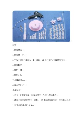 材料 1.熱溶膠槍。 2.熱溶膠一支。 3.三種不同花色蕾絲(A、B、C)各一碼(也可選自己喜歡的花色)。 4.鐵絲數支。 5.帽胚一個。 6.假花 2 朵 7.水鑽鍊 15cm。 8.固定夾 2 支。 準備工作 ‧將 B、C 兩種蕾絲,剪成長度不一的大小蕾絲數段。 ‧鐵絲也須剪成長度不一的數段,數量與蕾絲緞相同,每條鐵絲長度 比蕾絲緞稍長約 4~5cm。