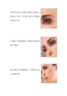 俐落有型的眉型,指腹沾取咖啡色系眼影以 點案的方式推勻,於眉頭、眼尾及下眼影處 局部灑上亮粉。 於眉頭下方連接眼影處,以膚咖啡色畫出較 強烈的鼻影。 桃紅色腮紅以圓弧輕輕刷上,搭配咖啡色系 口紅個性有型。