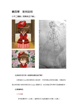 第四章 實例說明 ○不二周助(荒野的王子樣) (1)角色外型分析~這個角色適合自己嗎? 先前曾經 Cos 過同角色的正裝版本,已有準備此角色的經驗;考量該角 色在特別篇中是女性身份與 Coser 身體狀況,在扮演此版本時將不做纏胸動作。 (2)準備角色 ○分析圖 參考動畫原作(左圖),繪製為自己能看懂的分析圖(右圖)。