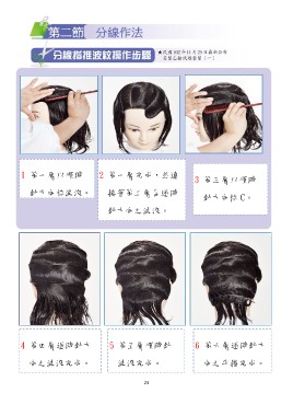 第二節 分線作法 1 第一層以順時 2 第一層完成,並連 3 第三層以順時 針方向梳波浪。 接著第二層為逆時 針方向梳 C。 針方向之波浪。 4 第四層逆時針方 5 第五層順時針 6 第六層逆時針方 向之波浪完成。 波浪完成。 向之平捲完成。 23