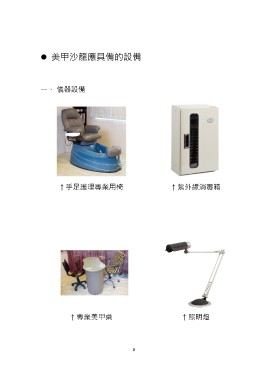 美甲沙龍應具備的設備 一、 儀器設備 ↑手足護理專業用椅 ↑紫外線消毒箱 ↑專業美甲桌 ↑照明燈 8