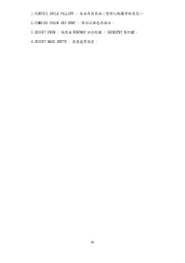 1.SURFACE ANGLE FALLOFF : 表面角度衰減(變得比較圓滑的意思)。 2.COMBINE COLOR AND BUMP : 將凹凸與色彩結合。 3.HEIGHT FROM : 高度由 BUMPMAP 凹凸貼圖 / GEOMETRY 幾何體。 4.HEIGHT MASK DEPTH : 高度遮罩深度。 40