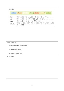 運算符號: Math 可以叫出數值常數,以及運算符號。例:123、+、><…. text 可以叫出字串常數,以及字串運算文字。例:「你好」、join、maketext. Logic 可以叫出邏輯常數。例:true、false、not… 可以宣告、變數、命名等等的。而宣告的方法,用 variable,並再後 Definition 方加一個常數 三、作業與討論 1.App Inventor 基本介面的說明。 2.Screen 元件的意義。 3.運算符號意義的實例。 四、心得分享 11