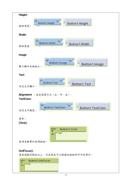Height 按鈕高度。 Width 按鈕寬度。 Image 圖片顯示在按鈕上。 Text 設定文字顯示。 Alignment :設定對齊方式(左、中、右)。 TextColor 設定文字顏色。 事件: Click() 使用者點擊和放開按鈕。 GotFocus() 當指頭移到按鈕之上,代表現在可以點選本按鈕時呼叫本事件。 13