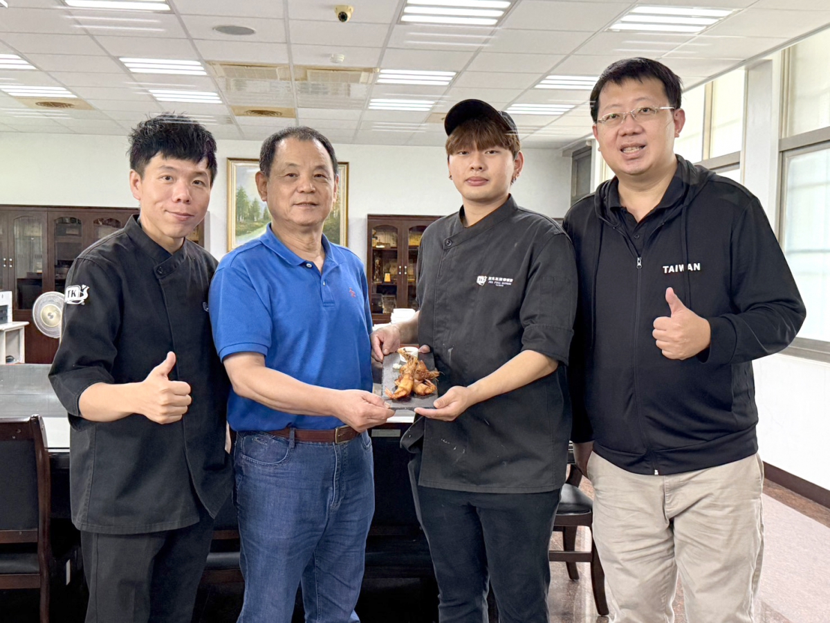樹德科技大學休觀系施君翰主任偕同提克斯國際餐飲劉柏楊執行長,率領目前就讀樹德科大休觀系陳政文同學(本校112級畢業校友),至本校指導餐管科學生製作韓國人氣女團最愛的「公主餐」,以鮮蝦輕裹金黃酥衣、香氣四溢,口感層次細膩迷人,深受偶像喜愛。