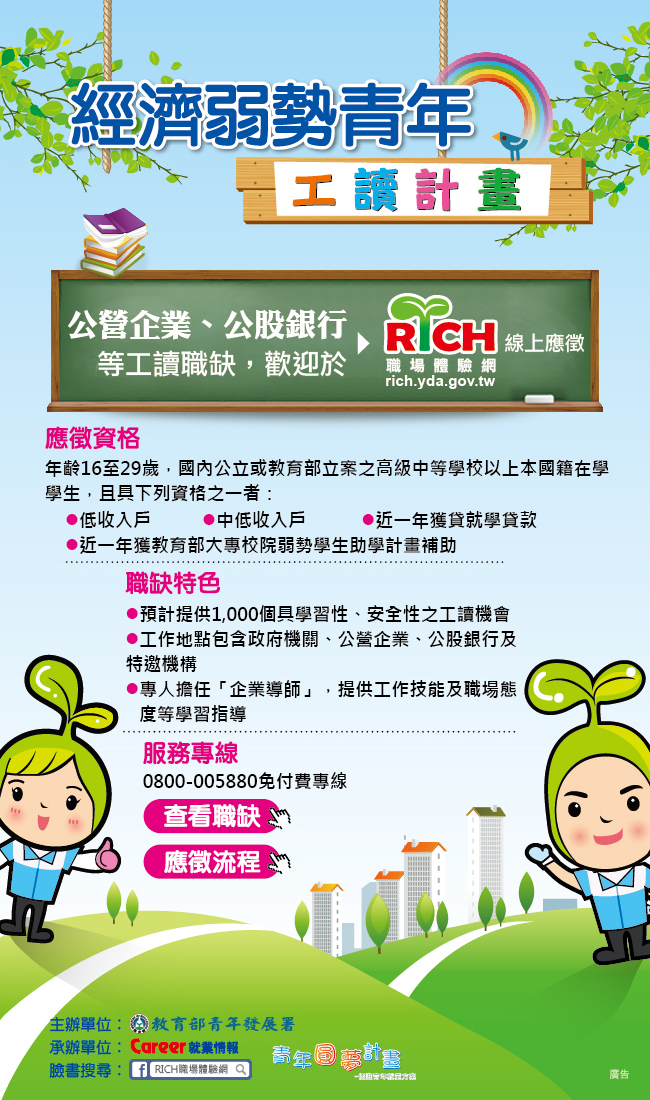 四、工讀職缺 : 已公告於教育部青年發展署RICH職場體驗網 (網址)